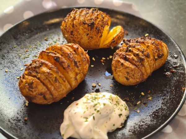 In der Zwischenzeit werden die Kartoffeln mehrmals ungefähr 2/3 tief eingeschnitten - nicht durchschneiden. Die eingeschnittenen Kartoffeln in eine Auflaufform oder auf ein Backblech setzten.